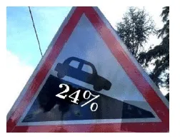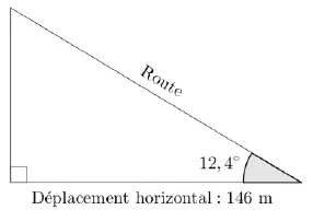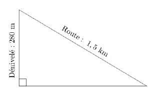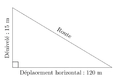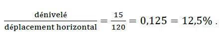 On obtient la pente d’une route en calculant le quotient du dénivelé (c’est-à-dire du déplacement vertical) par le déplacement horizontal correspondant. Une pente s’exprime sous forme d’un pourcentage.