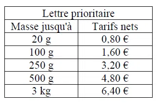 1. Il souhaite faire partir son courrier en lettre prioritaire. Pour déterminer le prix du timbre, il obtient sur internet la grille de tarif d’affranchissement suivante :