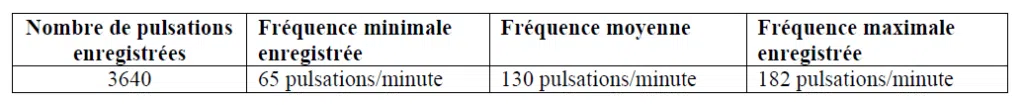 3. Après une séance d’entraînement, le cardiofréquencemètre lui a fourni les renseignements suivants :