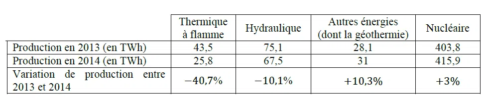 2. Le tableau suivant présente les productions d’électricité par les différentes sources d’énergie, en France, en 2013 et en 2014.