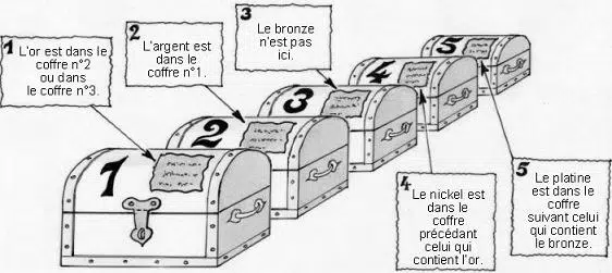 Un trésor est constitué de cinq lingots, chacun d’un métal différent : or, argent, platine, bronze et nickel. Chaque coffre contient un lingot. Sur chaque coffre sont gravés un chiffre et une affirmation.