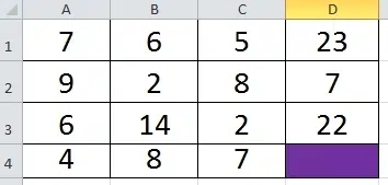 Dans le tableau de 4 lignes et de 4 colonnes ci-dessous, quel nombre se cache derrière la case violette ?