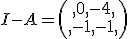Or I-A=\begin{pmatrix},0,-4,\,-1,-1,\end{pmatrix},cette matrice est inversible et (I-A)^{-1}=\begin{pmatrix},0,25,-1,\,-0,25,0,\end{pmatrix}